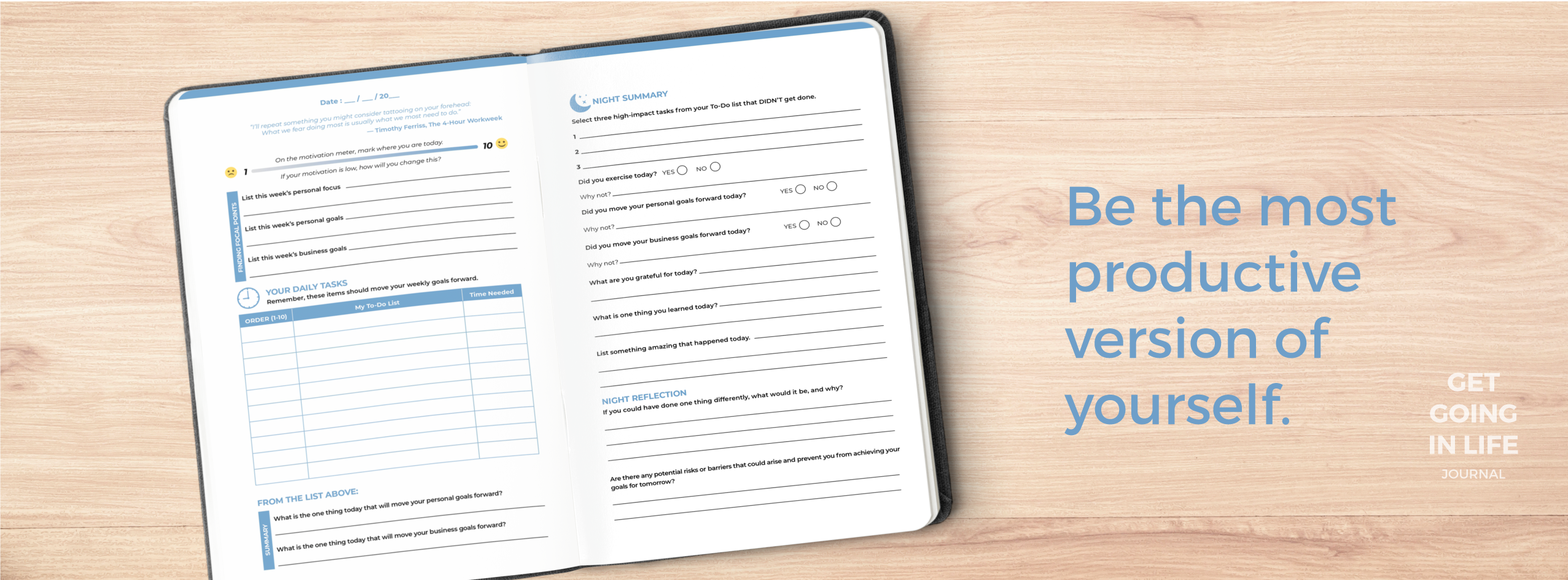 We created this journal because we felt overwhelmed by our to-do list, we struggled to prioritize our tasks, and "at the end of the day" we found ourselves easily distracted by social media. The Get Going In Life Journal is an effective tool to help you achieve your goals with ease. It reduces stress and anxiety, empowering you to focus solely on becoming the best possible version of yourself.